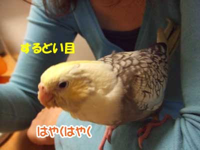 さし餌が終わると おとなしくしている。肩にとまらせるとじっとしてとまっている。