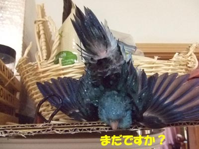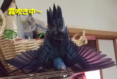 羽を広げたこの格好! 家では水浴び後に体を乾かすためドライヤーを使いますが、その時に、上手に?羽を広げ、体を膨らまし・・・正に写真の格好です!ちなみに家ではブルーとルチノーの二匹(今年3月生まれ)が居ますが、二羽共同じ格好です!
