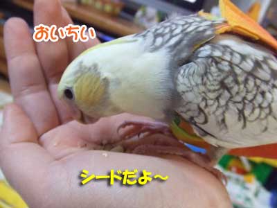夜にケージから出したときにすぐに飛んでいってしまう りんちゃんにシードで誘惑